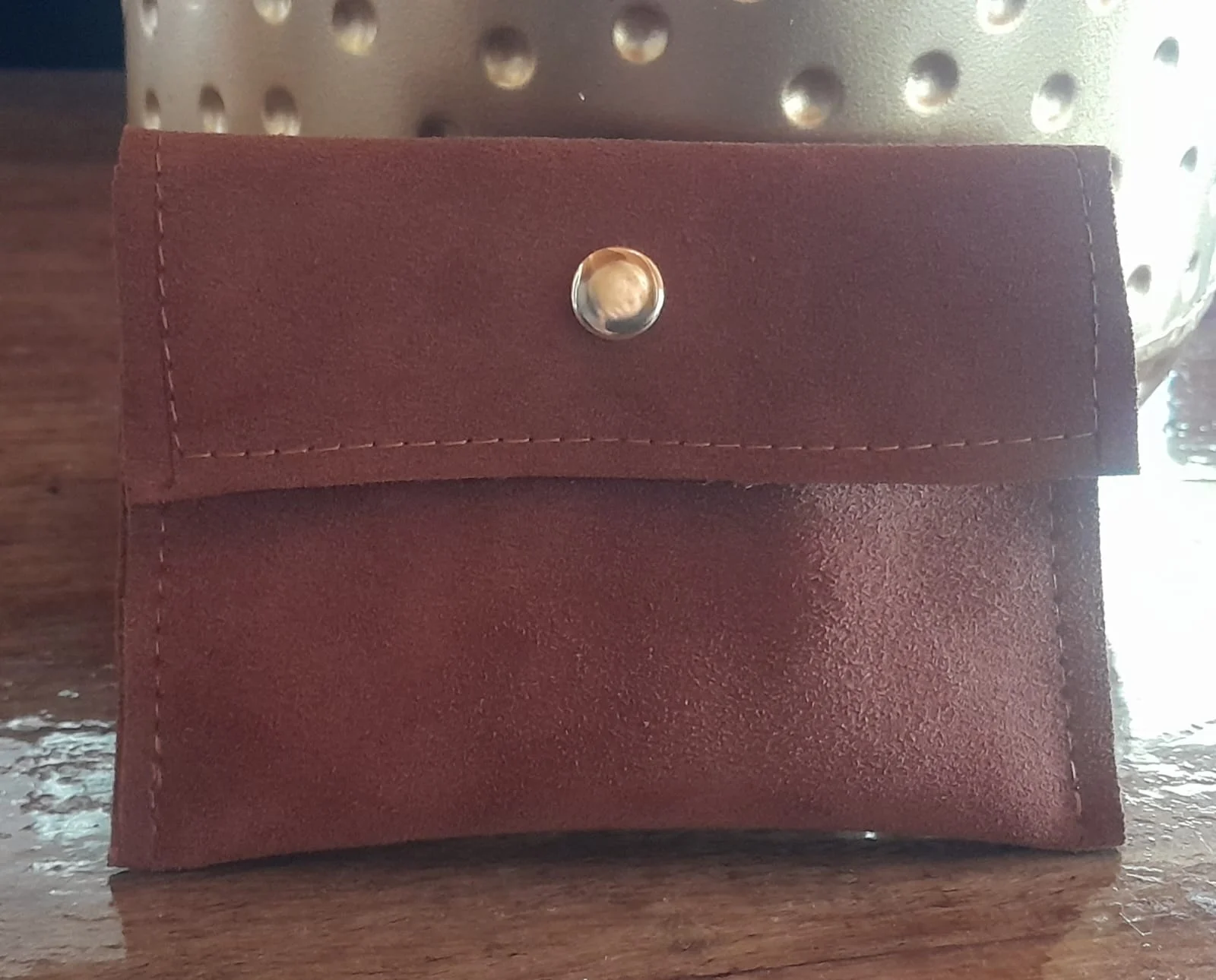 Estuche en cuero reno con broche color habano con cierre de broche, diseñado para guardar tarjetas, dinero u objetos pequeños. Producto con enfoque corporativo, ideal como regalo empresarial y como regalo empresa elegante.